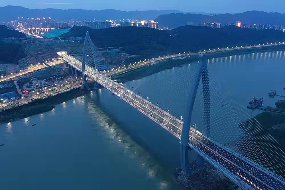 四川宜賓鹽坪壩長(zhǎng)江大橋是宜賓市城市內(nèi)環(huán)線的重要跨江節(jié)點(diǎn)工程,也是宜賓目前體量最大的橋梁。索塔是全國(guó)首次采用的“魚(yú)躍長(zhǎng)江”造型,猶如一條躍出水面、向上飛騰的江魚(yú)。