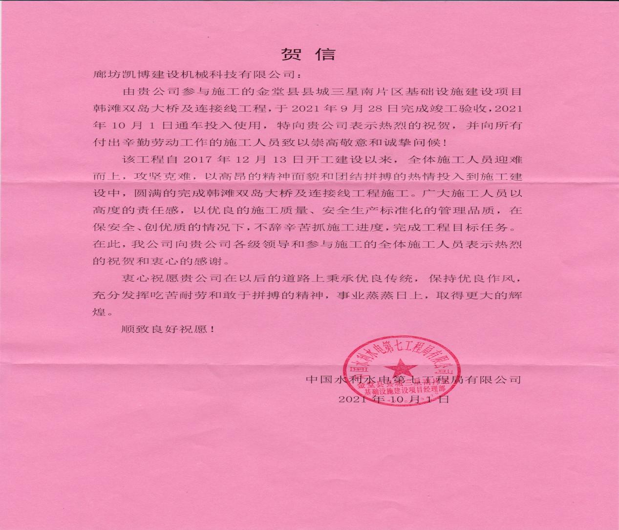 中國(guó)水電七局邀請(qǐng)我公司參加了金堂大橋的通車(chē)儀式、贈(zèng)送紀(jì)念品,并專(zhuān)門(mén)發(fā)來(lái)賀信,對(duì)我公司在項(xiàng)目合作中的支持配合與辛勤付出表示衷心感謝。